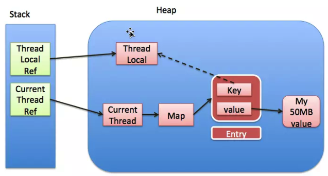 ThreadLocal.ThreadLocalMap的 Key 实现是弱引用,也即图中的虚线。弱引用不会阻止 GC,因此考虑下面的情况: