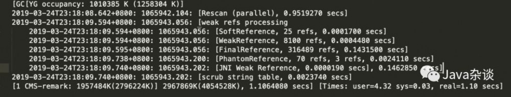 群里有人使用到了Swap区域。而对CMS GC如果有了解的话,想问的肯定是是不是加了“ -XX:+CMSScavengeBeforeRemark ”这个参数。在明确告知有这个参数。但是我在这个remark阶段并没有看到young gc,提问者就又截了一个全一点的日志,如下: