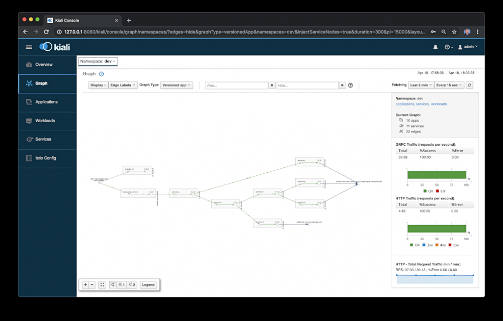 Kiali UI中的图形视图是运行在Istio服务网格中的组件的可视化表示。下图显示了过滤集群的dev命名空间,可以注意到Kiali已经映射了平台中的所有组件,以及丰富的元数据,比如它们的版本和通信协议。