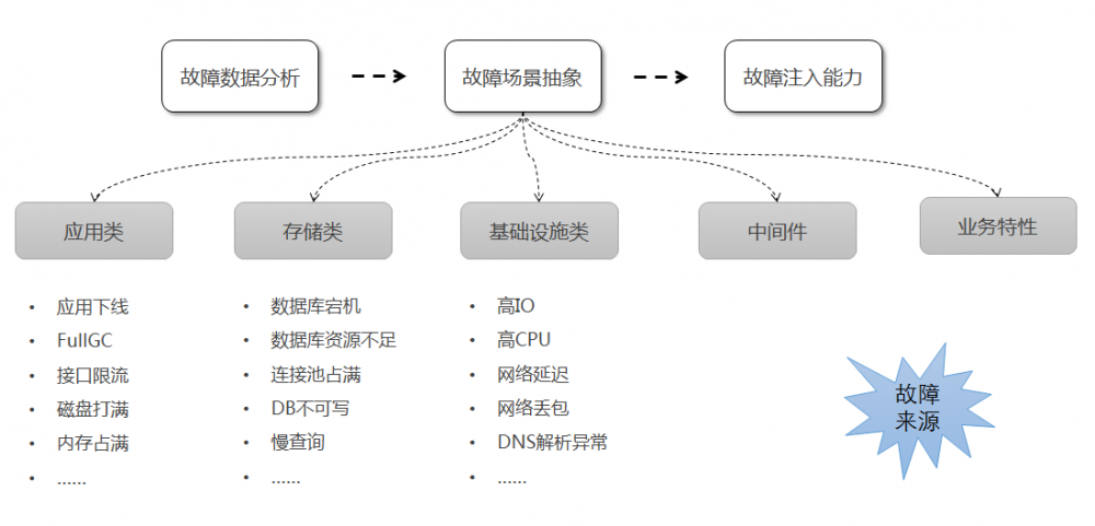 其次,为了更真实模拟线上故障,我们对历史故障数据进行了大量分析,将相关故障场景抽象为五大类:应用类、存储类、基础设施类、中间件、业务特性。抽象的故障场景即为需要实现的故障注入能力。