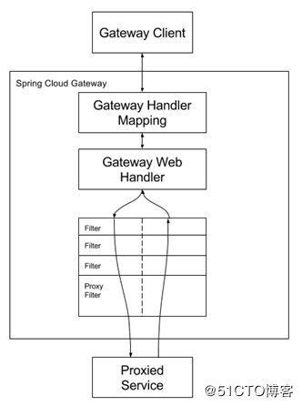 这是官方网站的工作原理示意图,从上图可以看出SCG在整个流程中主要担任反向代理的角色。客户端请求抵达SCG后,SCG通过Handler Mapping将请求路由到Web Handler,Web Handler再通过Filter对原始请求进行处理,最终发送到被代理的服务端。