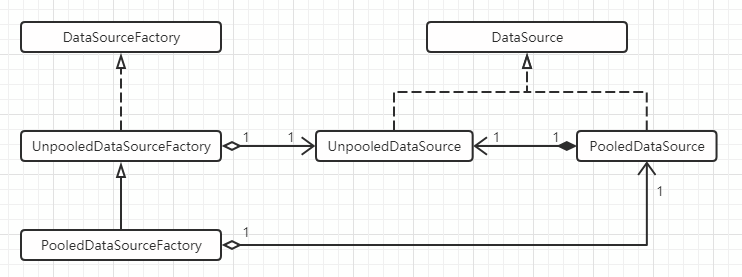 在利用SqlSessionFactoryBuilder创建DefaultSqlSessionFactory时,通过XMLConfigBuilder来读取上面config文件里的内容,看到dataSource的类型为POOLED,则利用反射创建PooledDataSourceFactory: