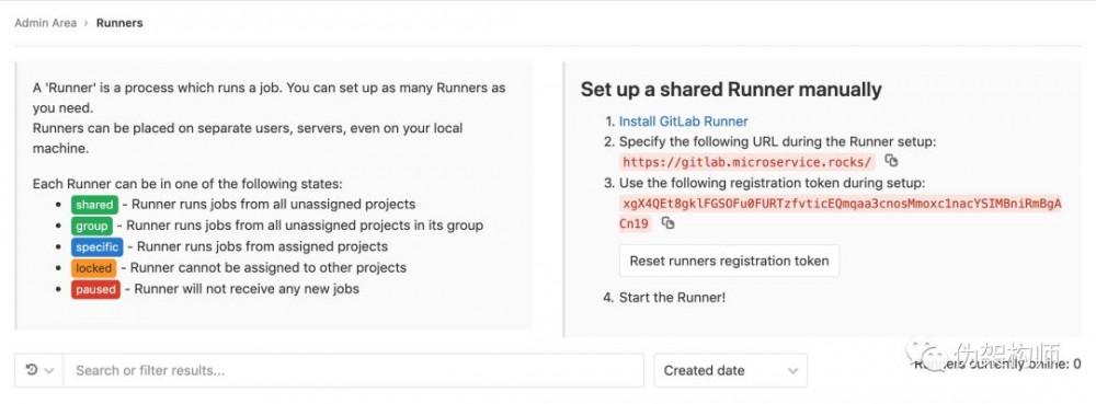 创建成功之后,打开页面 /admin/runners ,会看到其中列出了我们新建的 Runner: