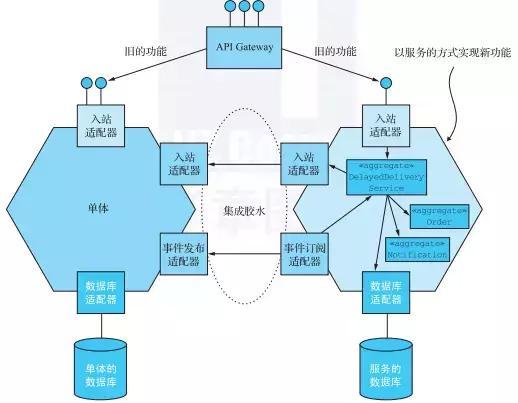 集成胶水的代码不是一个独立组件。相反,它由单体中的适配器和使用一个或多个进程间通信机制的服务组成。