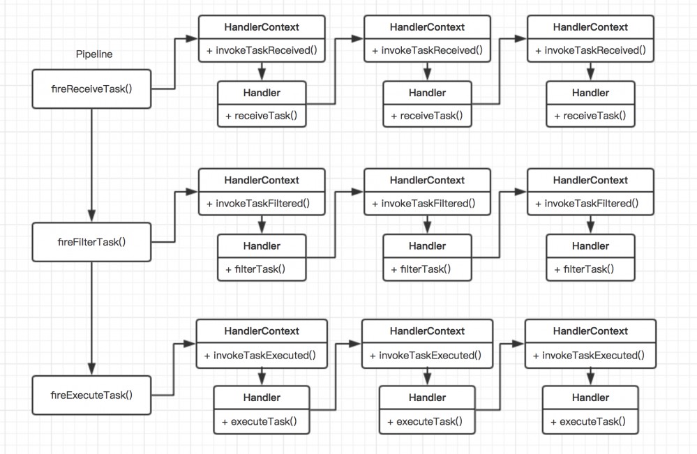 从图中可以看出,我们将整个流程通过 Pipeline 对象进行了抽象,这里主要分为了三个步骤:查询task,过滤task和执行task。在每个步骤中,我们都使用了一系列的链式调用。图中需要注意的是,在每次调用链的下一个节点的时候,我们都是通过具体的Handler进行的,也就是说是否进行链的下一个节点的调用,我们是通过业务实现方来进行动态控制的。