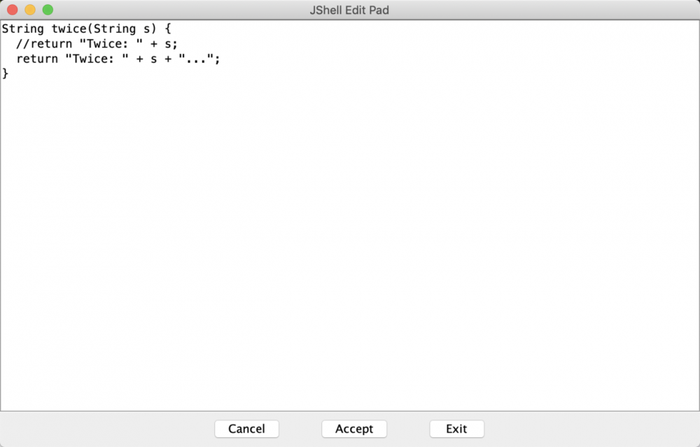 现在,我想对twice方法做一些改动,如果这时有外部代码编辑器的话,做起来会很容易。在 JShell 中可以启用JShell Edit Pad 编辑器,需要输入如下命令,来修改上面的方法: