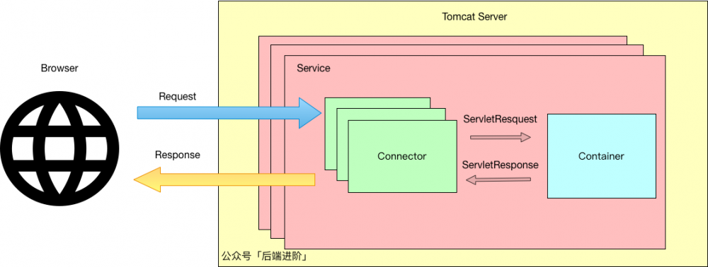 一个 Tomcat 代表一个 Server 服务器,一个 Server 服务器可以包含多个 Service 服务,Tomcat 默认的 Service 服务是 Catalina,而一个 Service 服务可以包含多个连接器,因为 Tomcat 支持多种网络协议,包括 HTTP/1.1、HTTP/2、AJP 等等,一个 Service 服务还会包括一个容器,容器外部会有一层 Engine 引擎所包裹,负责与处理连接器的请求与响应,连接器与容器之间通过 ServletRequest 和 ServletResponse 对象进行交流。