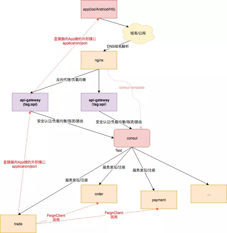 这里需要说明的是,在基于SpringCloud的微服务架构中,所有服务都是通过如consul或eureka这样的服务中间件来实现的服务注册与发现后来进行服务调用的,只是面向外部的服务接口会通过网关服务进行暴露,面向内部的服务接口则在服务网关进行屏蔽,避免直接暴露给公网。而内部微服务间的调用还是可以直接通过consul或eureka进行服务发现调用,这二者并不冲突,只是外部客户端是通过调用服务网关,服务网关通过consul再具体路由到对应的微服务接口,而内部微服务则是直接通过consul或者eureka发现服务后直接进行调用。 如果你想和更多微服务技术专家交流,可以加我微信liyingjiese,备注『加群』。群里每周都有全球各大公司的最佳实践以及行业最新动态 。