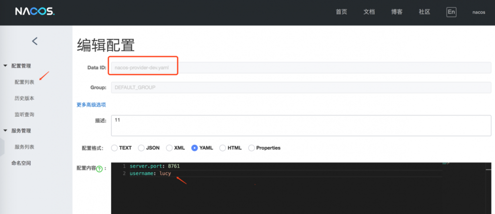 prefix 默认为 spring.application.name 的值,也可以通过配置项 spring.cloud.nacos.config.prefix 来配置。 spring.profile.active 即为当前环境对应的 profile,详情可以参考 Spring Boot文档 。 注意:当 spring.profile.active 为空时,对应的连接符 - 也将不存在,dataId 的拼接格式变成 ${prefix}.${file-extension} file-exetension 为配置内容的数据格式,可以通过配置项 spring.cloud.nacos.config.file-extension 来配置。目前只支持 properties 和 yaml 类型。 启动nacos,登陆localhost:8848/nacos,创建一个data id ,完整的配置如图所示: