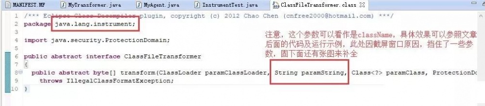 说了这么多,来点干货,下面用代码给大家演示一下如何向JVM中注册转换器实现AOP的。为了方便大家阅读, 重要的说明笔者已经写在代码的注释上或者图片空白处,大家注意查看。