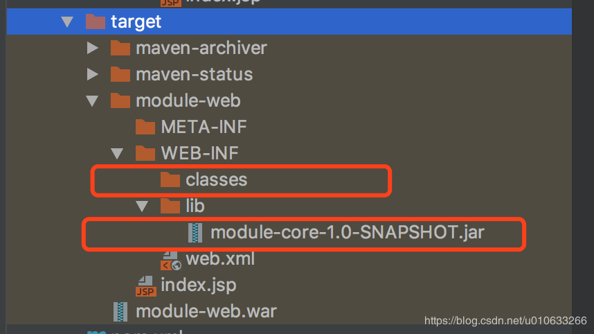 上文中项目如果改了依赖包core模块中的service服务代码,重启web服务是看不到改动效果的,这是因为依赖的core已经打成jar包给web模块使用了,重启并不会重新打jar包,所以只能重新package打包才能看到效果。 【解决方案】:把依赖的core模块,编译到web模块里面去,在web下生成core的class文件,这样重启编译就会实时更新界面了。 【未处理之前】: