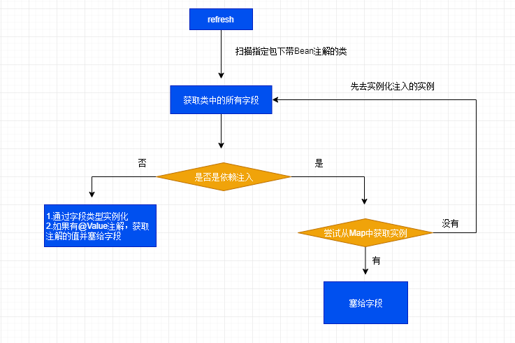 beanByClassMap 中获取对应的实例,如果没有,就先要去实例化该字段对应的类型。 Autowired autowired = field.getAnnotation(Autowired.class);