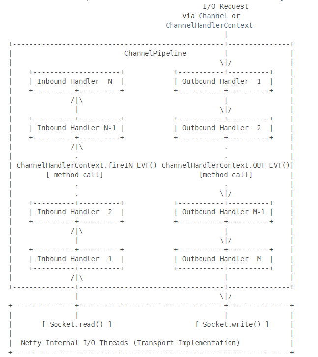 如图所示,入站事件是由 I/O 线程被动触发,由入站处理器按自下而上的方向处理,在中途可以被拦截丢弃,出站事件由用户 handler 主动触发,由出站处理器按自上而下的方向处理