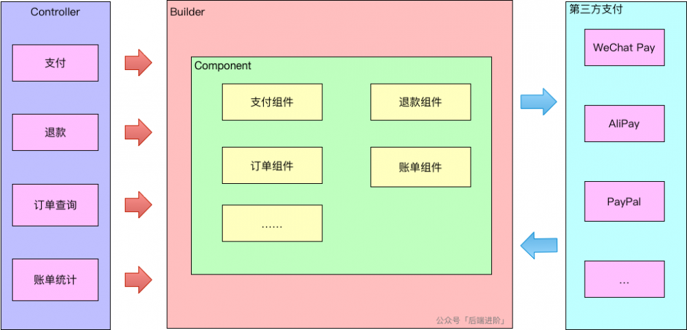 通过 Builder 模式根据请求参数构建对应的组件对象,将组件与外部分离,隐藏组件构建的实现。组件模式 + Builder 模式使得支付平台具备了高扩展性。