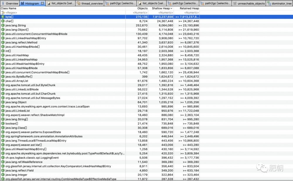 可以看到byte数组占用了接近JVM配置的最大堆的大小也就是8GB,显然这是OOM的原因。 第二步看一下究竟是哪些byte数组,数组是啥内容: