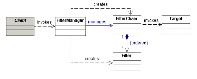 使用拦截过滤器作为可插拔过滤器来预处理和后处理请求和响应。过滤器管理器将松散耦合的过滤器组合在一个链中,将控制权委托给适当的过滤器。通过这种方式,您可以以各种方式添加、删除和组合这些过滤器,而无需更改现有代码。