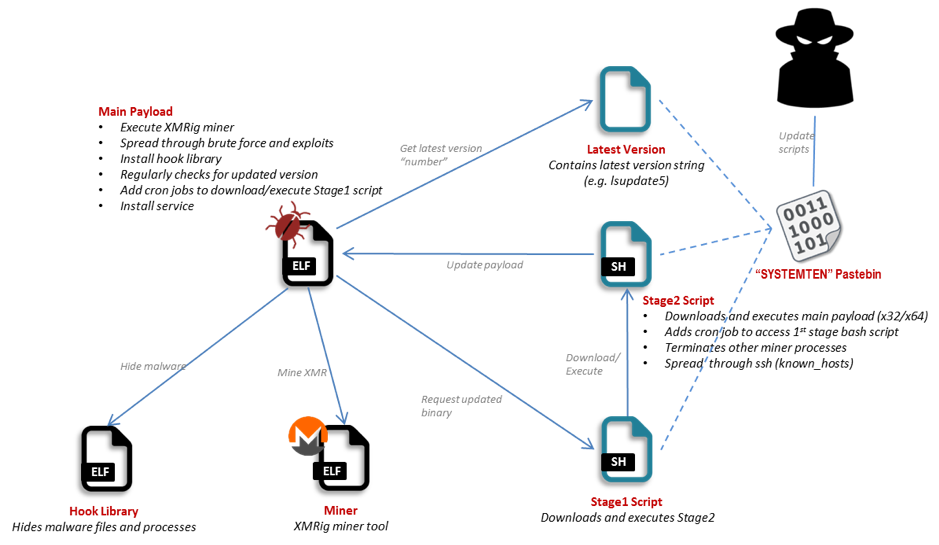 简而言之,感染始于第一阶段的脚本执行,该脚本可以通过各种方式安装到系统中,包括手动入侵、横向移动、互联网漏洞扫描、强制登录和漏洞利用等。
