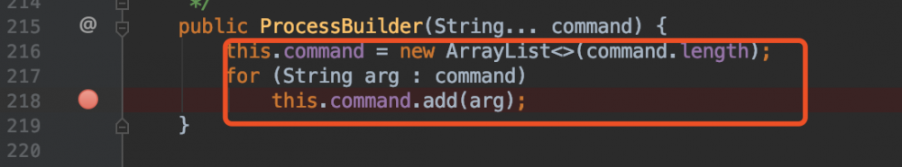 这里我选择在 java.lang.ProcessBuilder 接收 array 类型数据传入的地方下个断点。