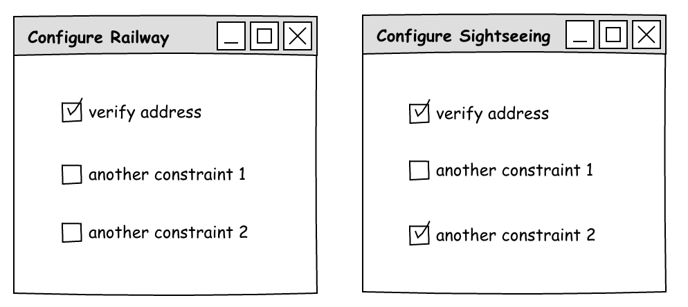 # railway placeOrderRule.RAILWAY.deliverableAddressRequired=true placeOrderRule.RAILWAY.anotherConstraint1=false placeOrderRule.RAILWAY.anotherConstraint2=false # sightseeing placeOrderRule.SIGHTSEEING.deliverableAddressRequired=true placeOrderRule.SIGHTSEEING.anotherConstraint1=false placeOrderRule.SIGHTSEEING.anotherConstraint2=true