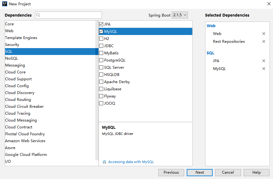 首先创建一个 Spring Boot 工程,引入 Web 、 Jpa 、 MySQL 、 Rest Repositories 依赖: