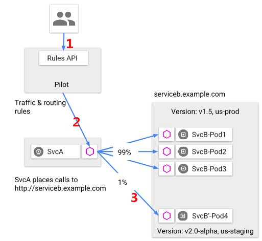 灰度发布的过程在《Istio,灰度发布》一文中已经有过描述,今天重点说说 Pilot 和 Envoy 的交互流程与内部结构。