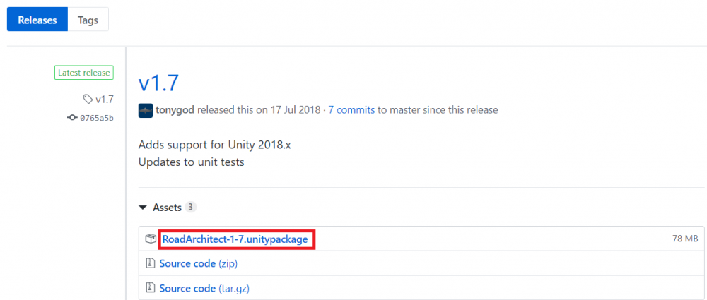 1、根据作者推荐,从 https://github.com/MicroGSD/RoadArchitect/releases 页面直接下载RoadArchitecture-1-7.unitypackage。
