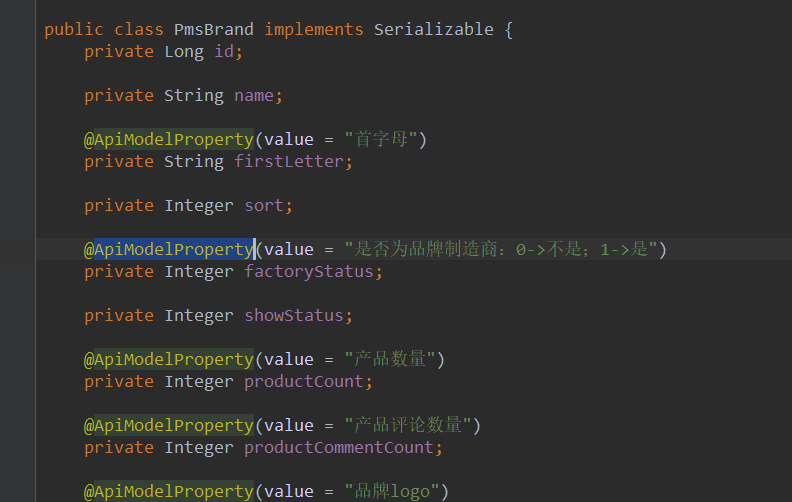 运行com.macro.mall.tiny.mbg.Generator的main方法,重新生成mbg中的代码,可以看到PmsBrand类中已经自动根据数据库注释添加了@ApiModelProperty注解