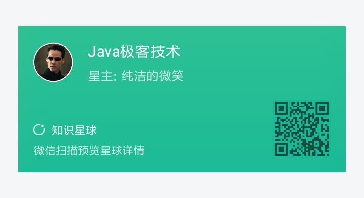 现在 Java 极客技术的作者团队已经达到了十几人,每天都在输出高质量的文章,但是苦于公众号无法留言的痛处,因此对很多读者提出的问题,作者很难和读者之间交流,读者与读者之间也无法交流。所以我们创建了一个 《Java 极客技术》的知识星球。在知识星球里面我们可以更好的跟大家交流,解决大家的问题。另外知识星球有个更好的地方就是知识容易沉淀,所有积累下来的知识都是可以回溯的,这不仅对前人有复习作用,还可以让新人快速发现高质量问答内容。所以我们欢迎大家到知识星球去交流,当然星球是付费的,付费的原因是一种筛选,将伸手党排除在外,寻找一些真正喜欢技术的朋友。为了照顾早期关注并支持我们的朋友,我们将星球的价格设置为最低的50元/年,仅限前1000名用户。一杯咖啡的价格,就可以跟一群热爱技术的人一起交流,一杯咖啡的价格给自己一个机遇,说不定哪一天大家还有其他合作的机会呢?生活就是这样,需要处处留心,一点点积累,说不定哪天幸运就会降临,就像我一样。
