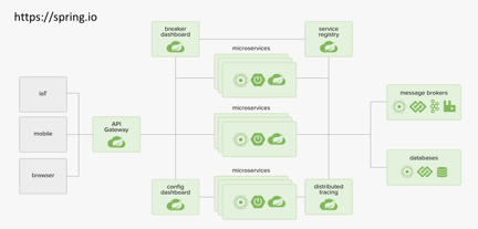 Spring Cloud提供了微服务架构中的众多组件,例如API网关、注册中心、负载均衡、熔断限流、服务追踪。下图是Spring官方给出的一个类似于Spring Cloud微服务框架的解决方案架构图。
