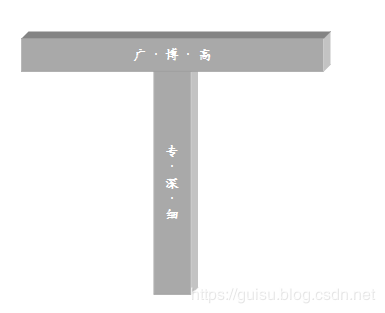 T型人才是指按知识结构区分出来的一种新型人才类型。用字母“T”来表示他们的知识结构特点。“—”表示有广博的知识面,“|”表示知识的深度。两者的结合,既有较深的专业知识,又有广博的知识面,这类集深与博于一身的人才。
