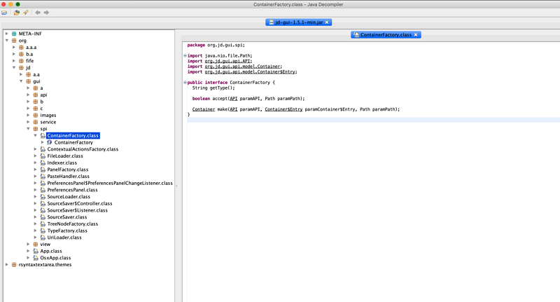 我用的是mac电脑,从官网: http://java-decompiler.github... 下载JD-GUI,官网有很多版本,下载后安装打开即可,导入你想反编译的jar,我这里随便找了个jar包做演示