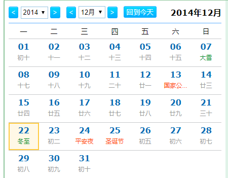 其定义是这样的,以星期一为周始,以星期日为周末,第一个包含该年度四天以上的周,算作该年度的第一周,因此, 2014-12-31 按 YYYY 解析出来的年是 2015 ,我截了一张万年历的图,如下: