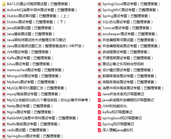 给大家分享了这么多面试心得,想必大家也有很多的收获,这里给读者也准备了真材实料的面试题,虽说面试题从来就不是一成不变的,但基本上也是从原本的面试题里面找灵感,我在这里整理了bat最新的一些面试真题(JVM与性能优化,dubbo服务框架,MYSQL性能优化,spring面试专题等)