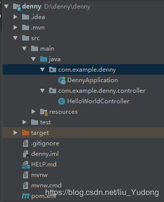 #### DennyApplication.java 创建项目时自动生成,是Spring boot的启动文件 #### HelloWorldController.java 自定义的控制层,生成web #### pom.xml 关键配置文件