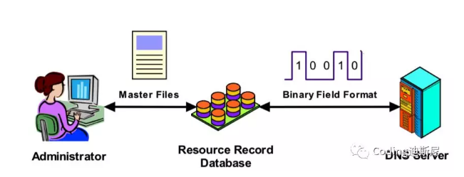 我们还需要关注域名信息如何在服务器上存储。在域名服务器上,信息存储有两种方式,一种是域名信息以二进制格式存储,这种格式对应的名称叫Resource Record Filed Format,同时为了方便管理员管理,这些信息又通过文本形式展现出来,对应的格式称为Master File Representation,管理员通过修改后者就能使得对应的二进制信息进行相应变换: