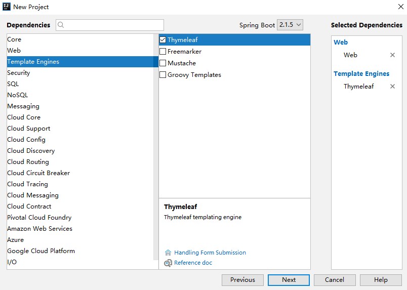 Spring Boot 中整合 Thymeleaf 非常容易,只需要创建项目时添加 Thymeleaf 即可: