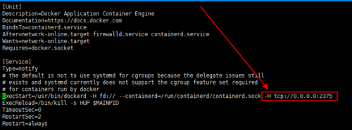 找到 ExecStart ,在最后面添加 -H tcp://0.0.0.0:2375 ,如下图所示