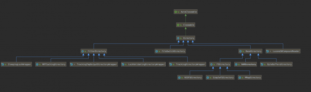 BaseDirectory同样是一个抽象类,提供了其子类共有的 获取索引文件锁 的方法,即维护了一个LockFactory对象,索引文件锁的概念已经在前面的文章中介绍,这里不赘述。 下图中为BaseDirectory类的子类: