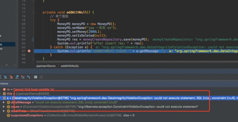 System.out.println("addWithNull field: " + e.getMessage());