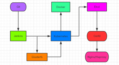 图为 GIT+Jenkins+Kubernetes+Docker+Etcd+confd+Nginx+Glusterfs 架构 :