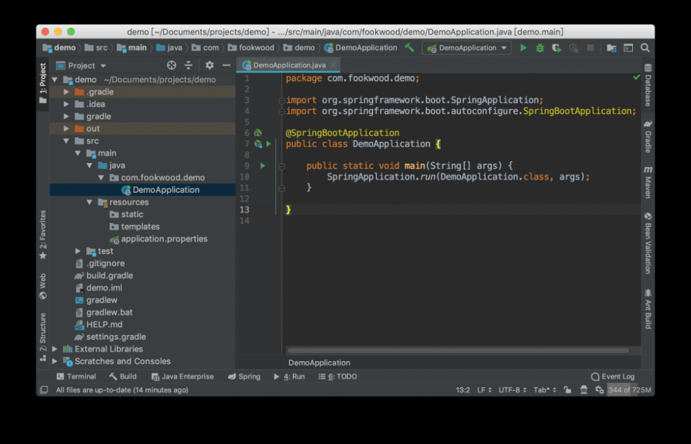 先来一张IntelliJ IDEA的截图,为项目刚创建时候的状态。左侧为项目目录区,右侧为代码区。左边,右边和下边都有工具栏,你可以打开终端,可以查看类结构,可以查看Build时候的信息,可以查看运行时候的信息,可以查看Gradle和Maven的依赖以及任务,可以连接数据库,可以查看Spring相关的东西比如各种Bean及其关联等等。界面最上方是文件的目录以及运行相关的按钮。