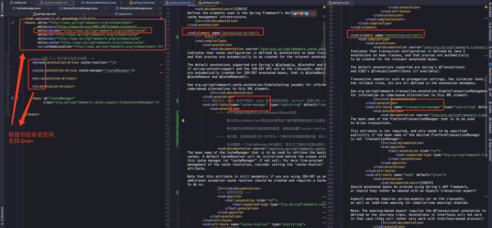 首先我们看到, <tx> <cache> <mvc> 和 <myname> 都是自定义标签,左一是配置文件,进行 bean 的定义,顶部的 xmlns 是命名空间,表示标签所属的定义文件,像事务、缓存、 MVC 的命名空间都是固定的。