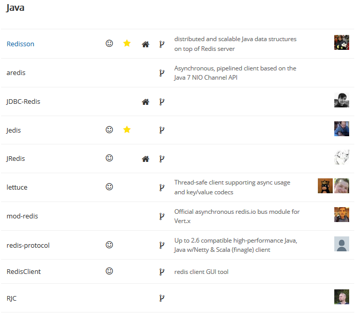 查看 redis 官网,我们发现用 Java 操作 redis,我们有多种解决方案,如下图:
