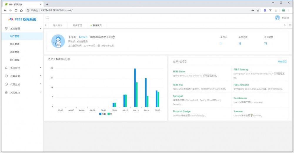 FEBS-Shiro是一款简单高效的后台权限管理系统,使用Spring Boot,Shiro和Layui构建。FEBS意指: F ast, E asy use, B eautiful和 S afe。相信无论作为企业级应用,私活开发脚手架或者权限系统构建学习,FEBS-Shiro都会是一个不错的选择。
