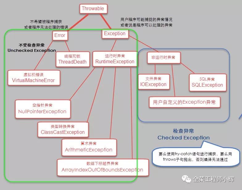 Exception:在Exception分支中有一个重要的子类RuntimeException(运行时异常),该类型的异常自动为你所编写的程序定义ArrayIndexOutOfBoundsException(数组下标越界)、NullPointerException(空指针异常)、ArithmeticException(算术异常)、MissingResourceException(丢失资源)、ClassNotFoundException(找不到类)等异常,这些异常是不检查异常,程序中可以选择捕获处理,也可以不处理。这些异常一般是由程序逻辑错误引起的,程序应该从逻辑角度尽可能避免这类异常的发生;而RuntimeException之外的异常我们统称为非运行时异常,类型上属于Exception类及其子类,从程序语法角度讲是必须进行处理的异常,如果不处理,程序就不能编译通过。如IOException、SQLException等以及用户自定义的Exception异常,一般情况下不自定义检查异常。