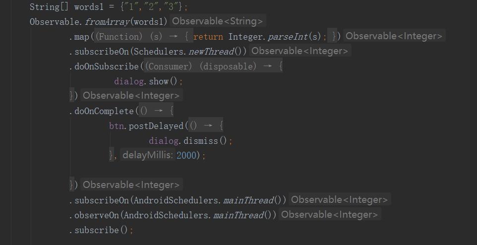 咳咳,看不懂了吧,看不懂就对了,看着的确是变复杂了,But 代码这一连串链式调用下来不是显得代码逻辑很清晰吗.而且随着业务需求的增多,你可能需要拿到图片id时还要加一层过滤呢,只需要在加一个.xxx()方法即可,而且还可以随意切换操作线程,代码依然还是这么清晰简洁.而且使用Android studio 打开时还会自动缩进和显示提示信息: