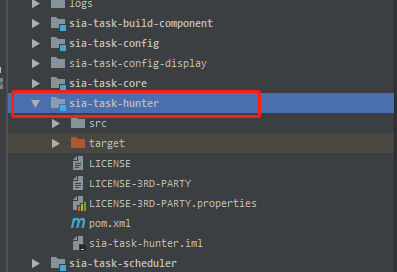 该示例为springboot项目,并且需要通过POM文件引入SIA-TASK的执行器关键依赖包sia-task-hunter来实现task执行器的自动抓取,首先需要将SIA-TASK源码中的sia-task-hunter包用mvn install命令打包为jar包安装至本地仓库,SIA-TASK源码中的sia-task-hunter包如下图示: