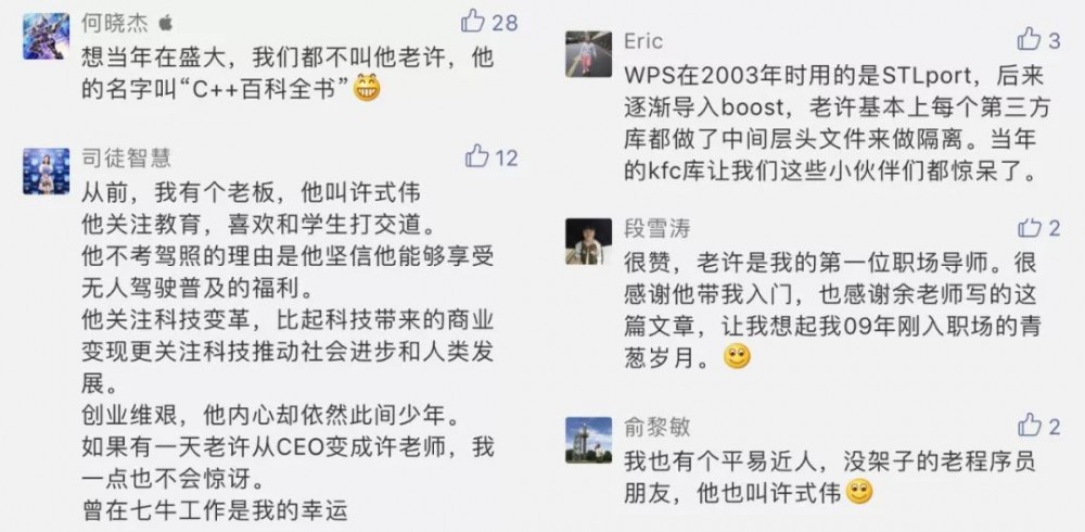 说到这里,前阵子看老许在盛大的前同事余晟,写了篇关于他的文章,评论区有几条留言挺有意思,分享给你看看: