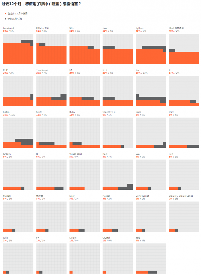 JavaScript 则是 最常用的整体编程语言 ,这个结果也并不意外,毕竟“能用 JavaScript 实现的,最终都会用 JavaScript 实现”,所以 JavaScript 被广泛使用也不足为奇。