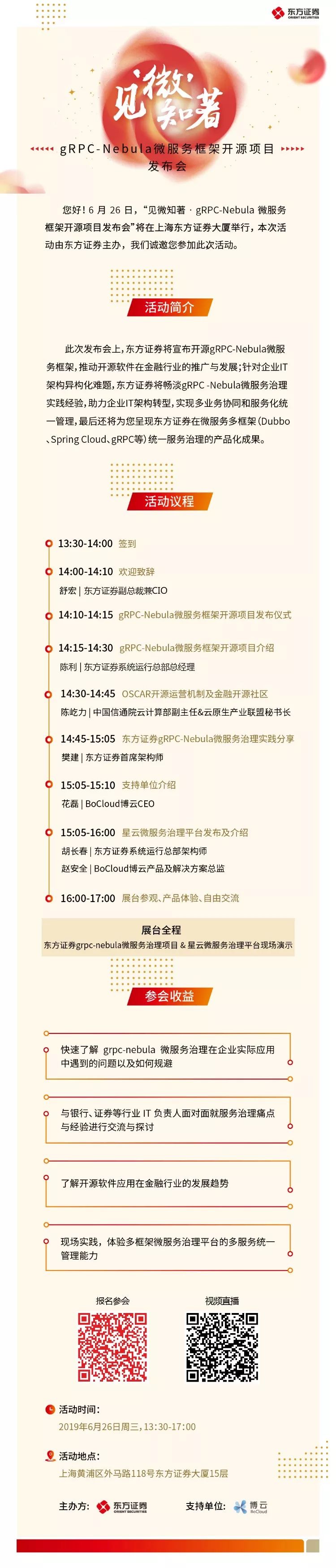 6月26日,“见微知著· gRPC-Nebula微服务框架开源项目发布会”将在上海东方证券大厦举行,本次活动由东方证券主办,我们诚邀您参加此次活动。